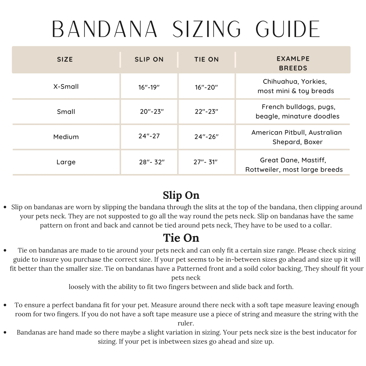 - Bandanas are hand made so there maybe a slight variation in sizing. Your pets neck size is the best inducator for sizing. If your pet is inbetween sizes go ahead and size up.